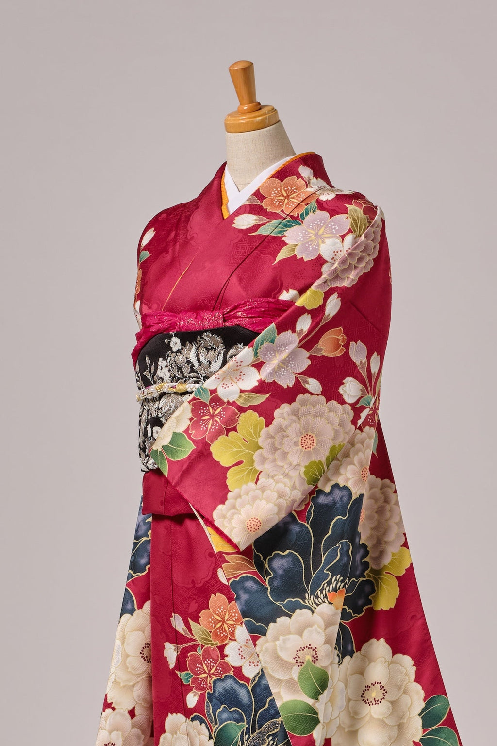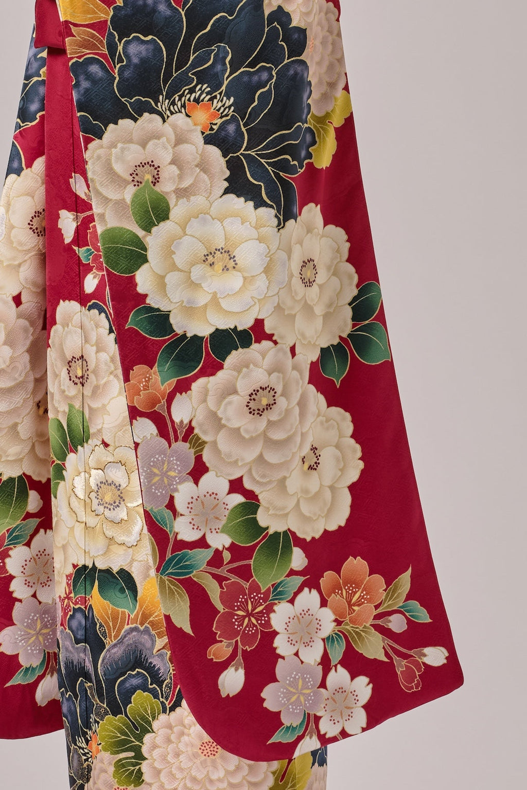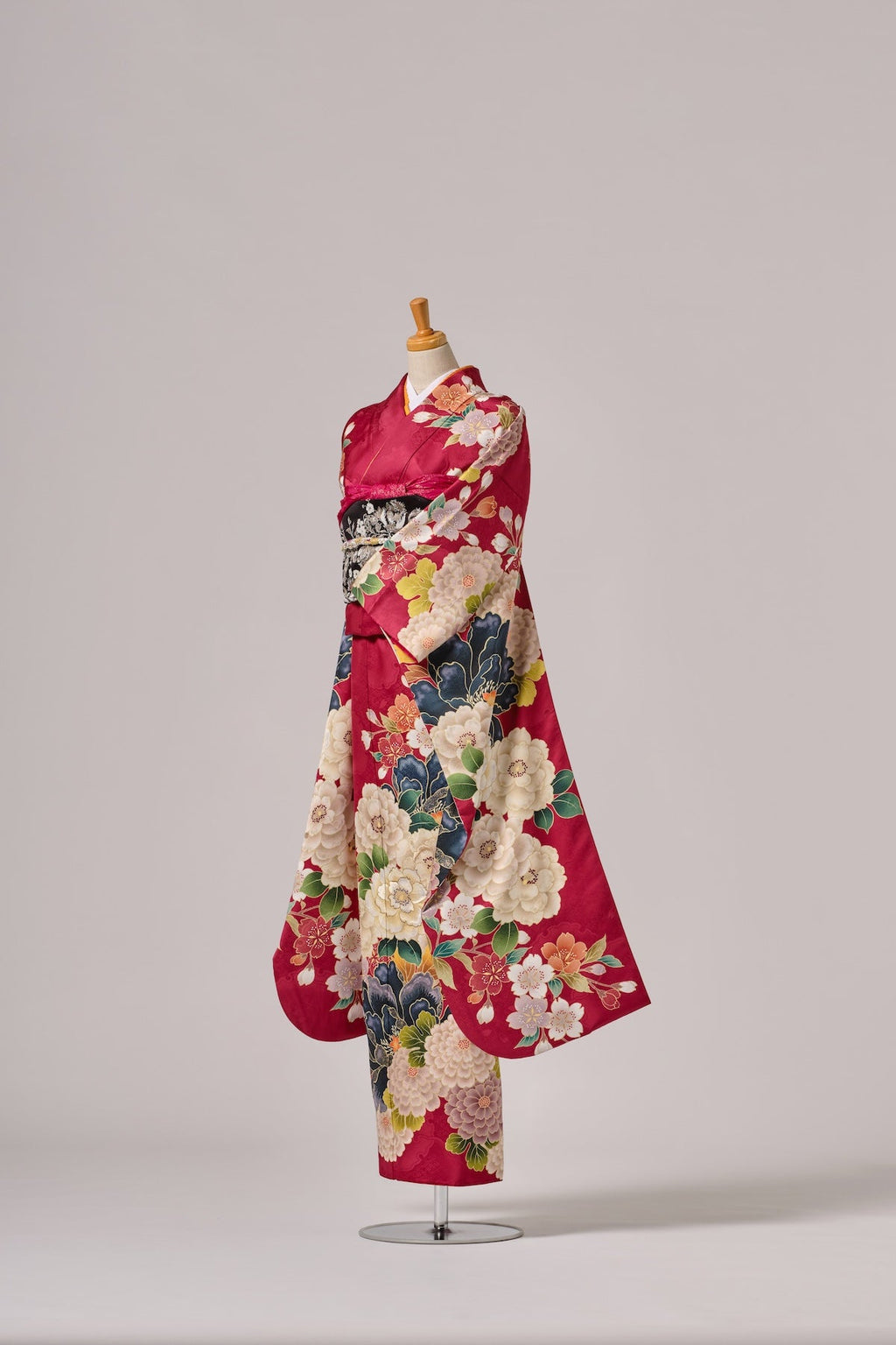 鮮やかな赤地に、大輪の牡丹や菊が咲き誇る華やかで迫力ある振袖です。格式とモダンさを兼ね備えた印象的な一着です。