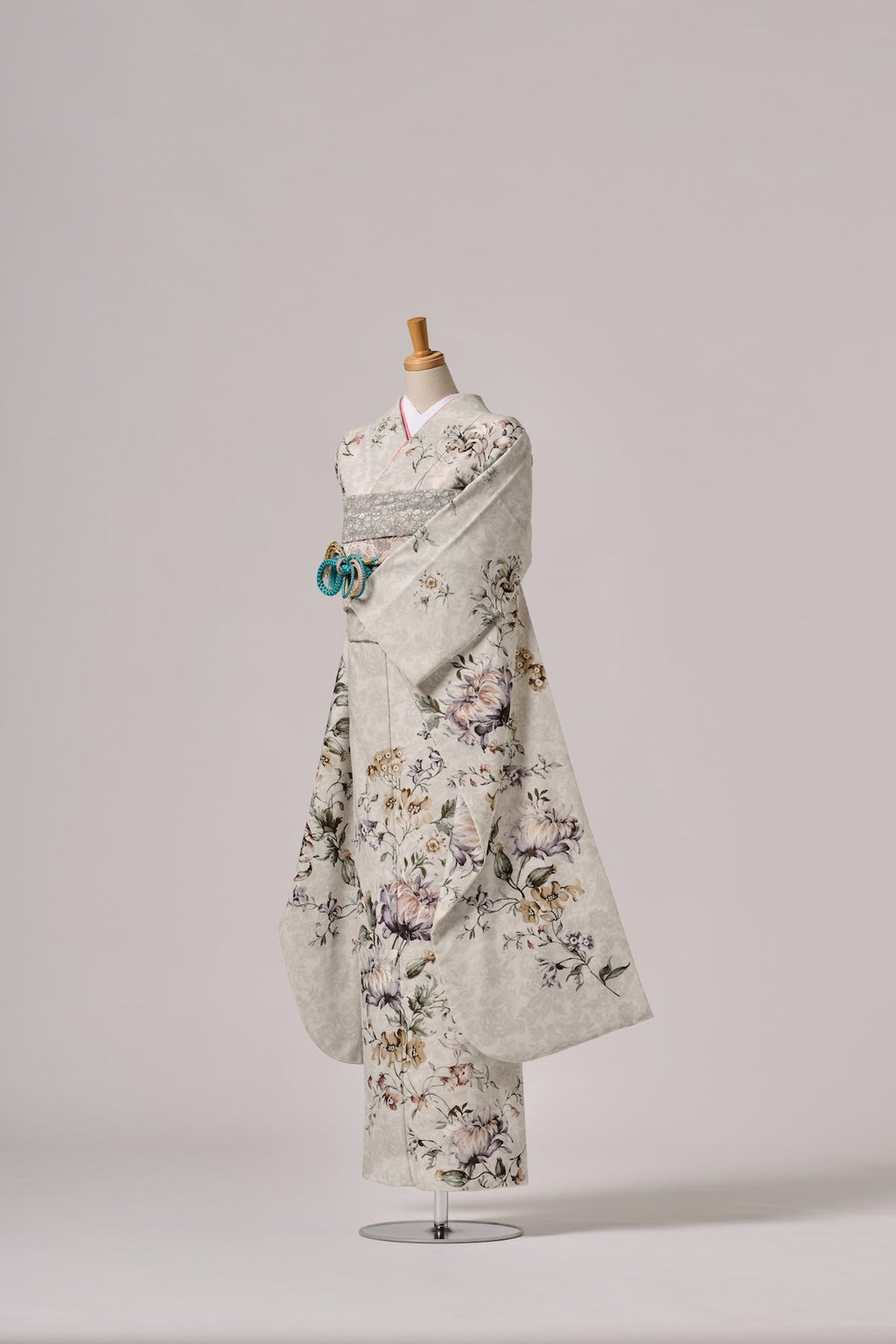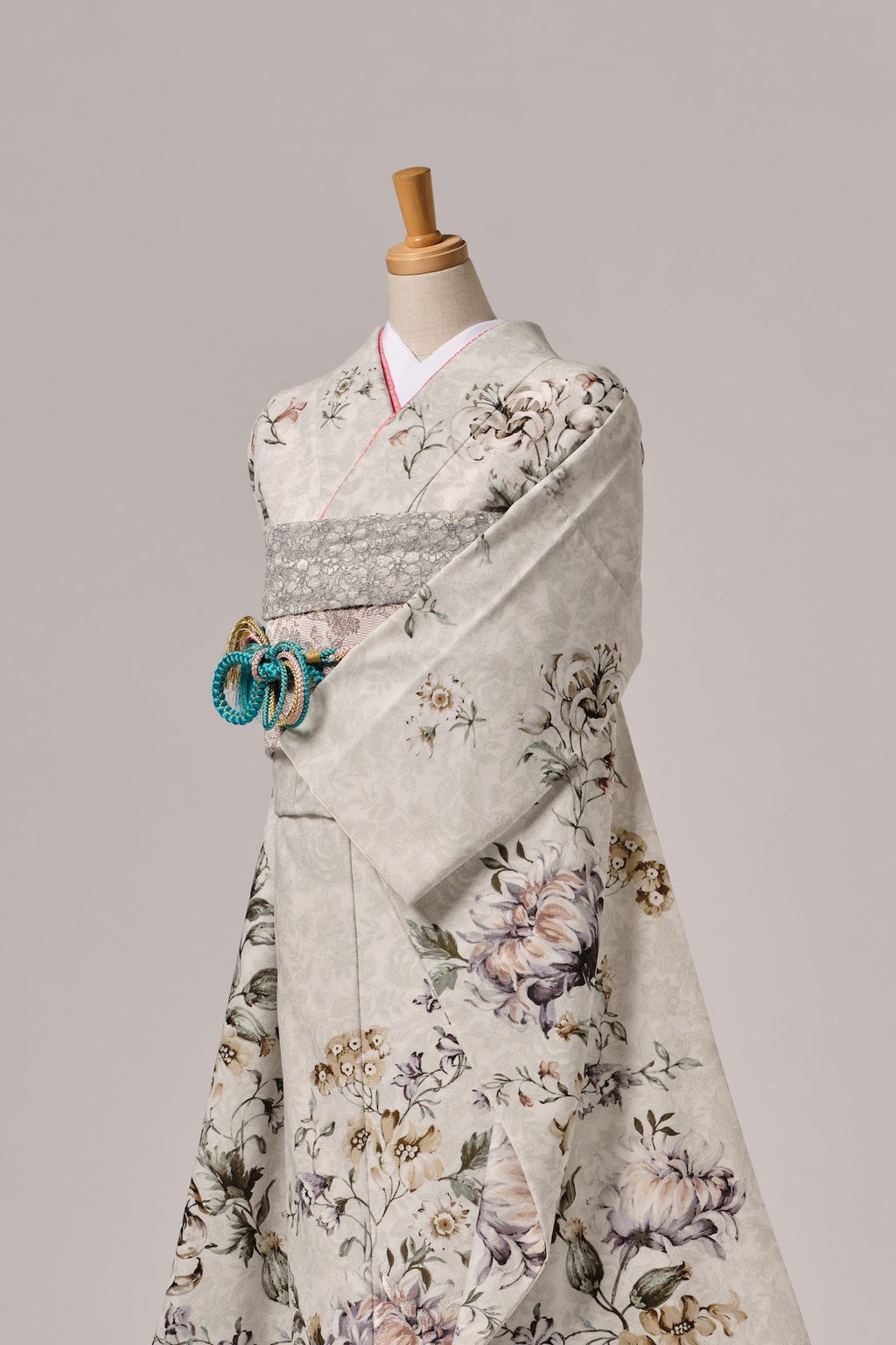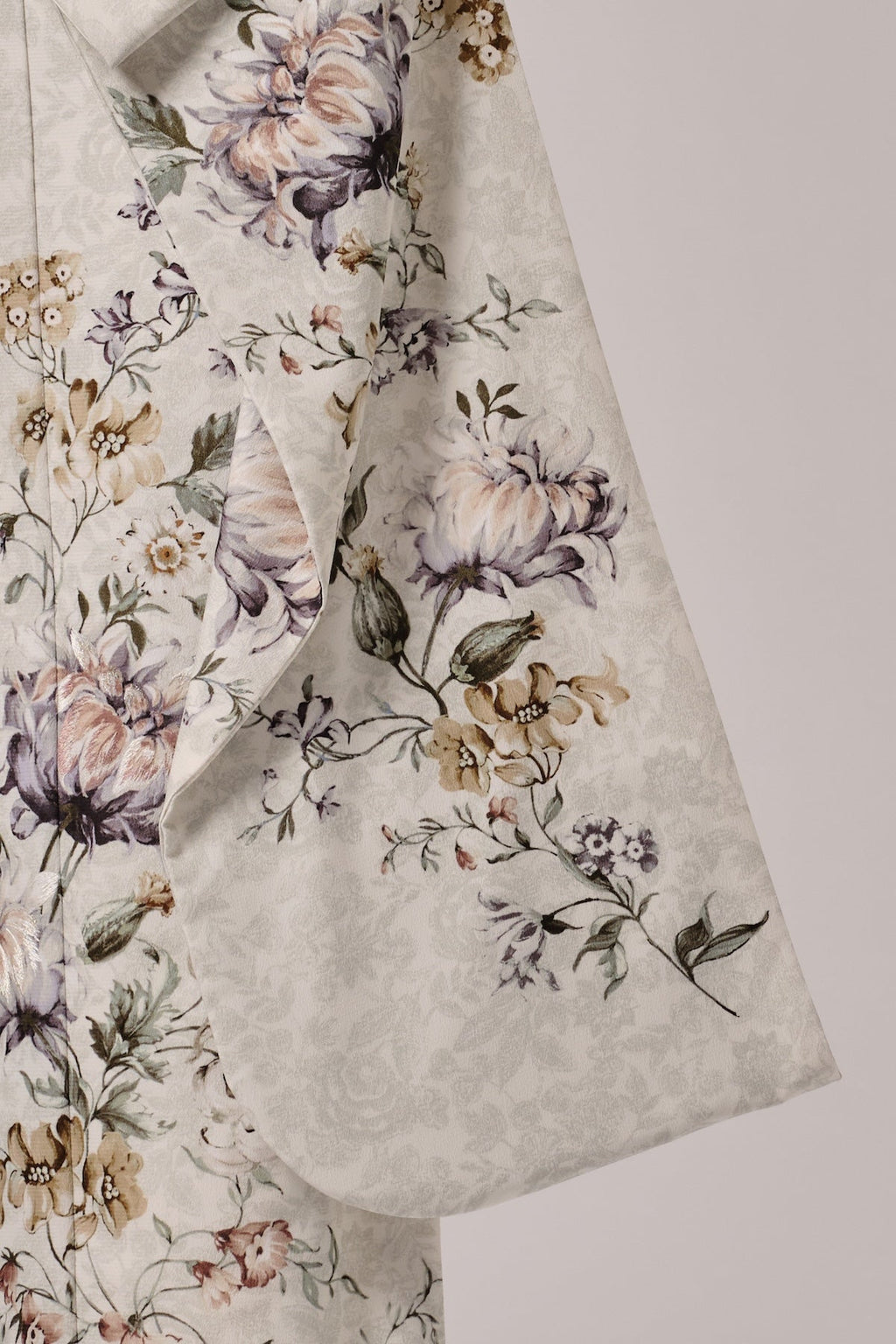 淡いグレーベージュの地に、繊細な筆致で描かれた牡丹や菊が優雅に咲く上品な一着。落ち着いた華やかさが、洗練された雰囲気を演出します。