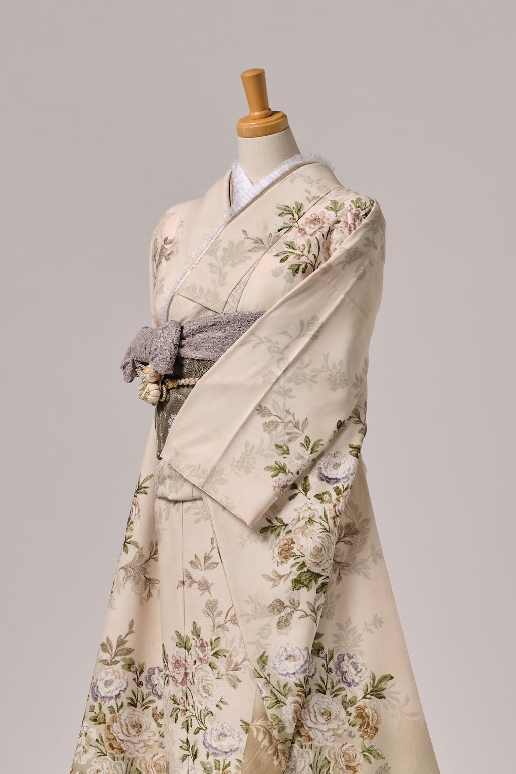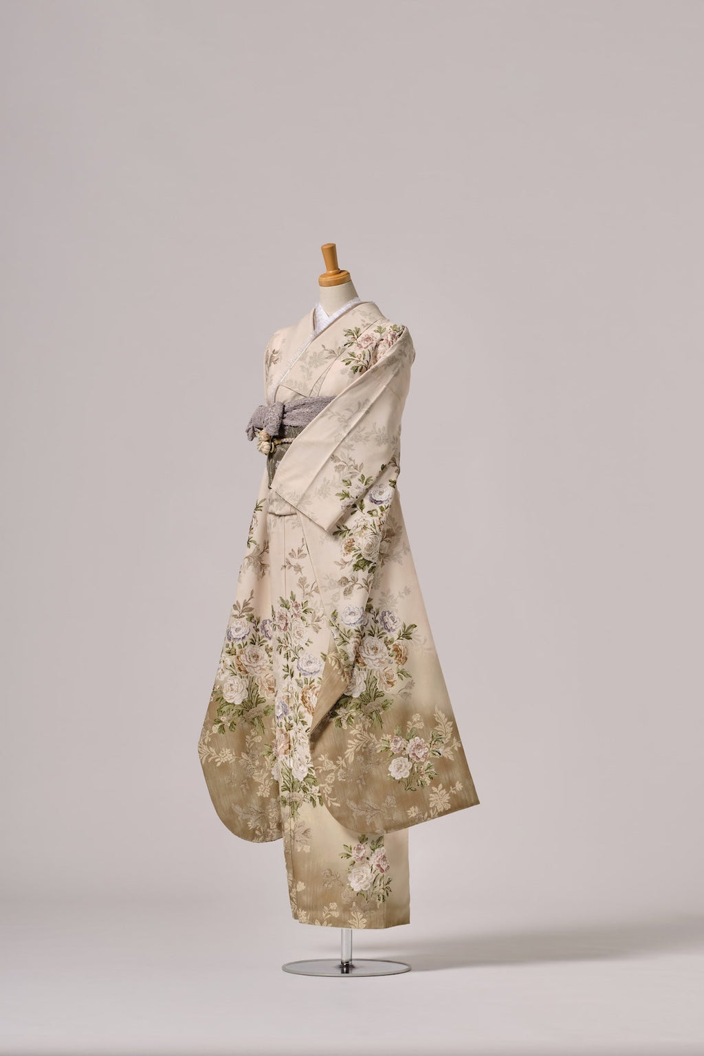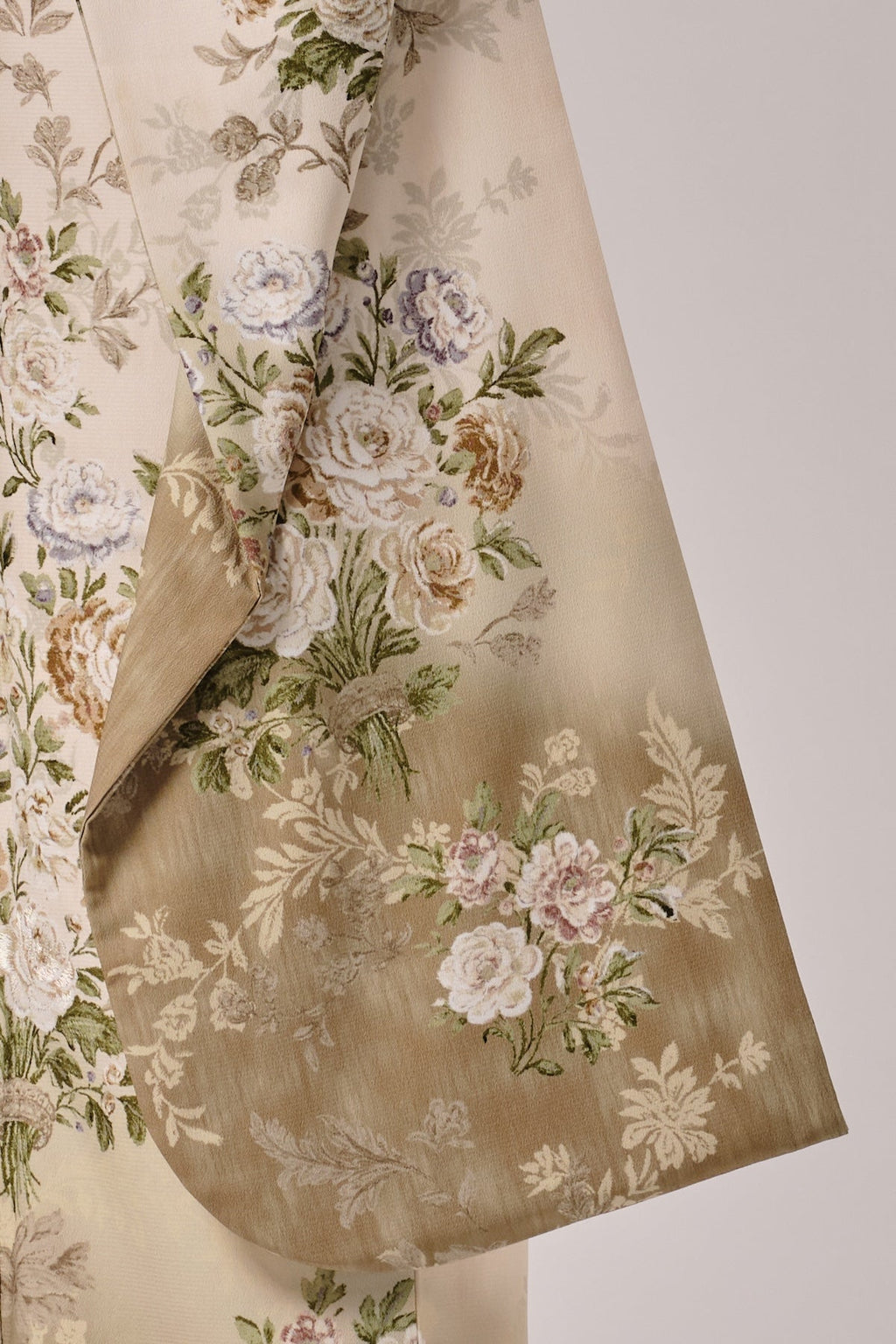 柔らかなベージュからブラウンへのぼかし地に、優美な草花文様が描かれた気品漂う振袖です。クラシカルな美しさが際立つ一枚となっています。