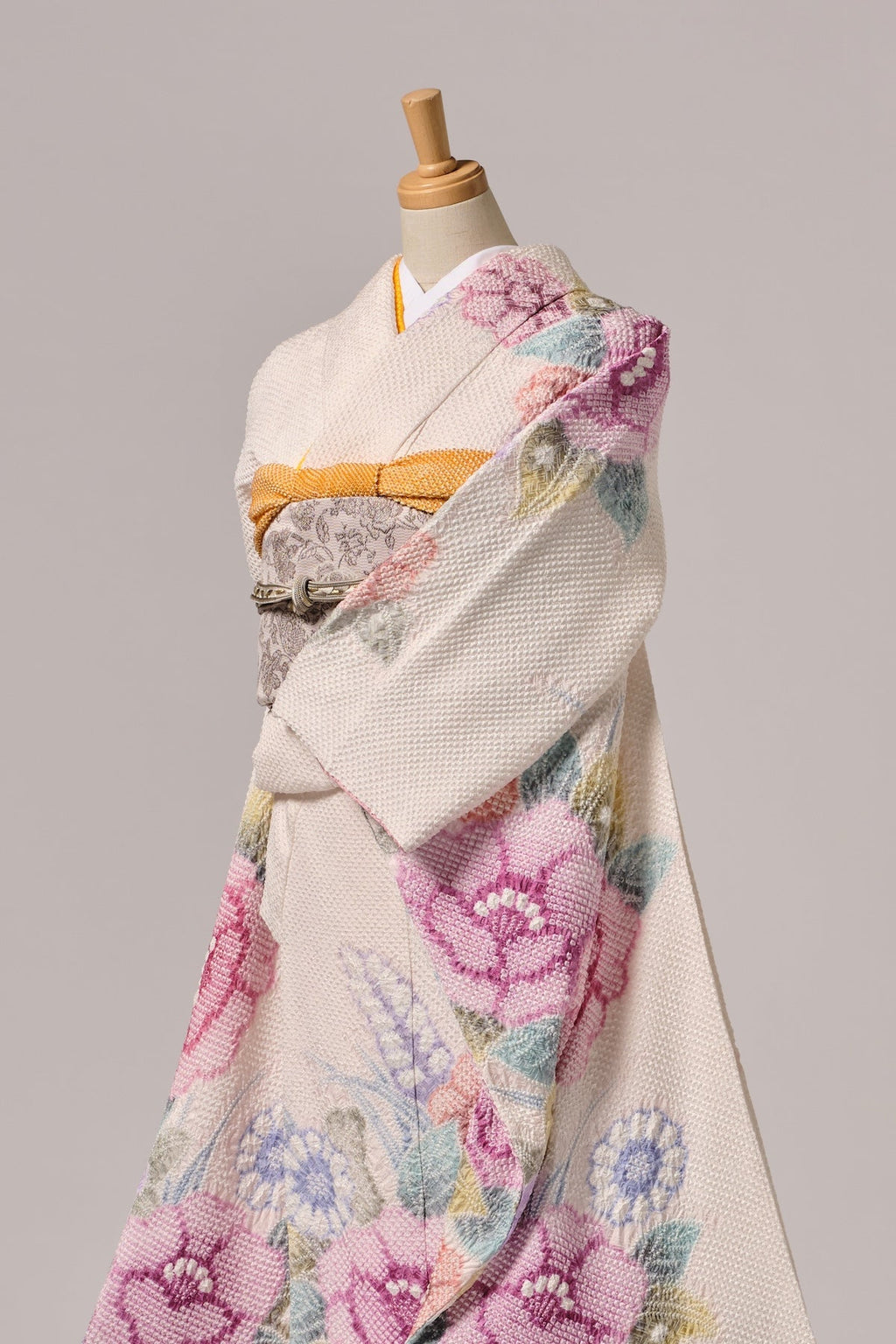 清らかな白地に施された絞りが、可憐で上品な印象を引き立てます。
