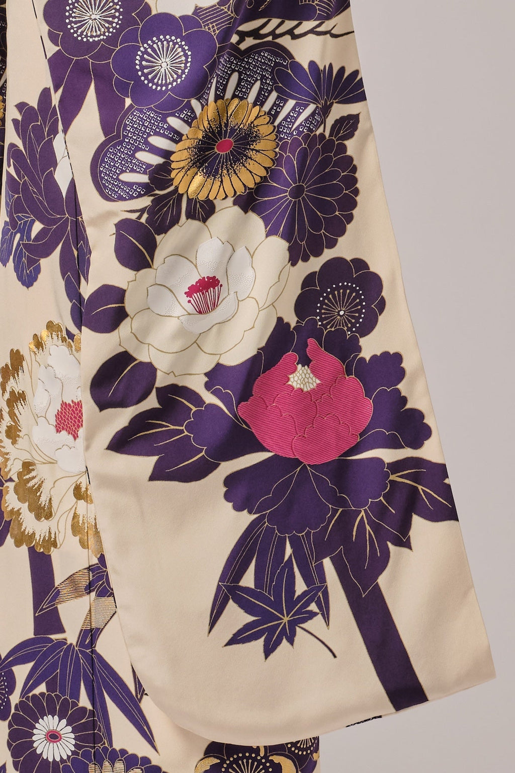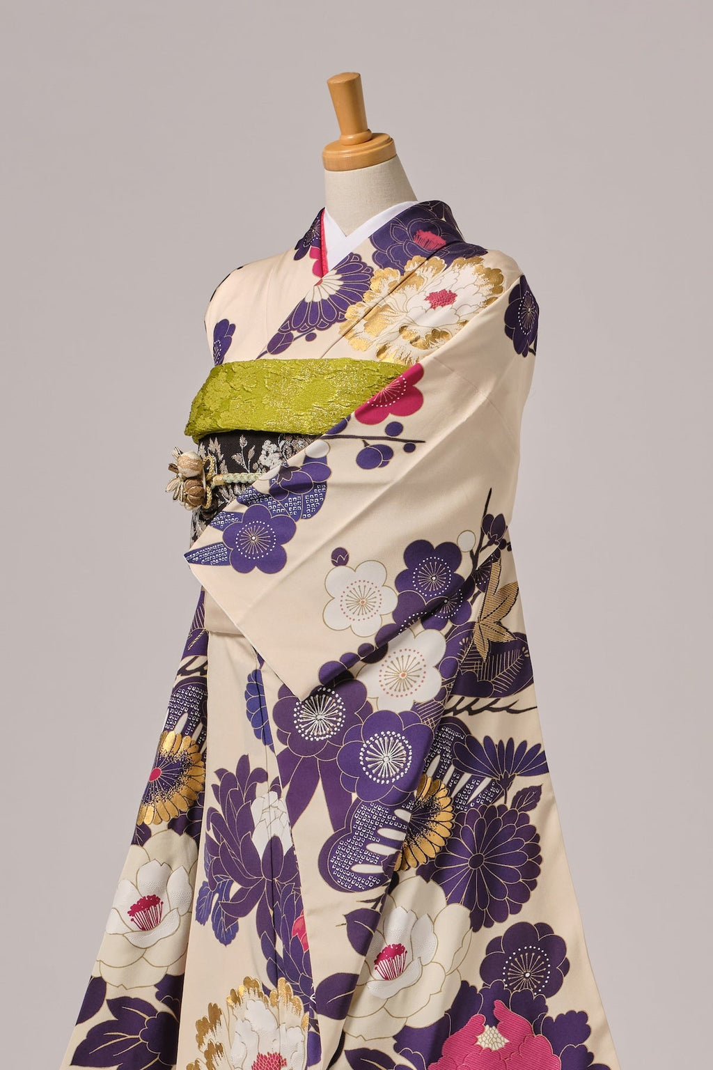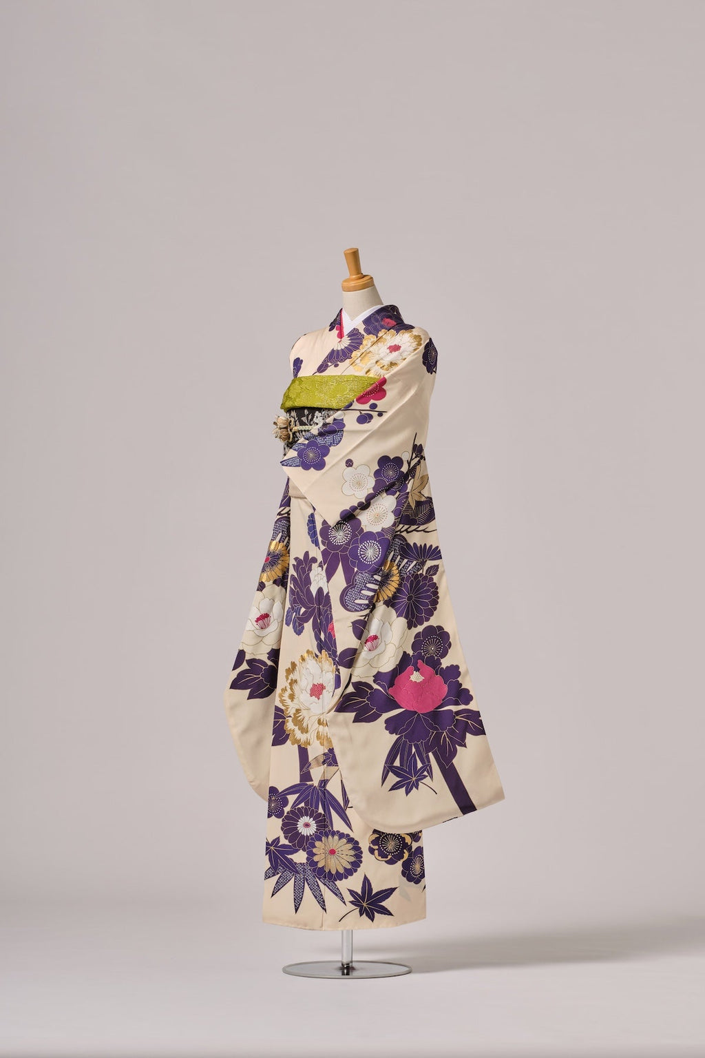 ベージュと紫のコントラストが美しく印象的な1着。優雅な印象と、落ち着いた華やかさで幅広い世代に好まれる一着です。