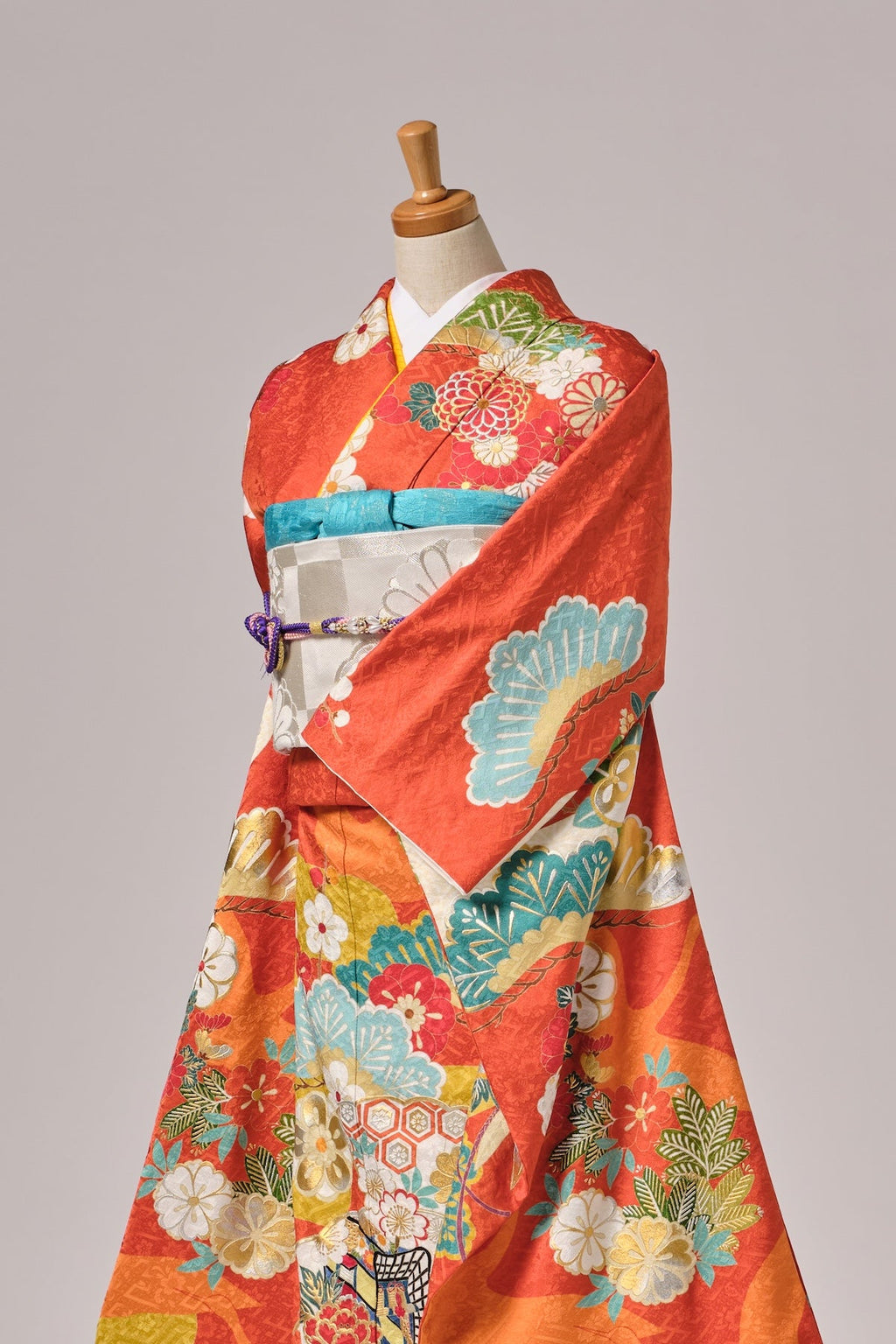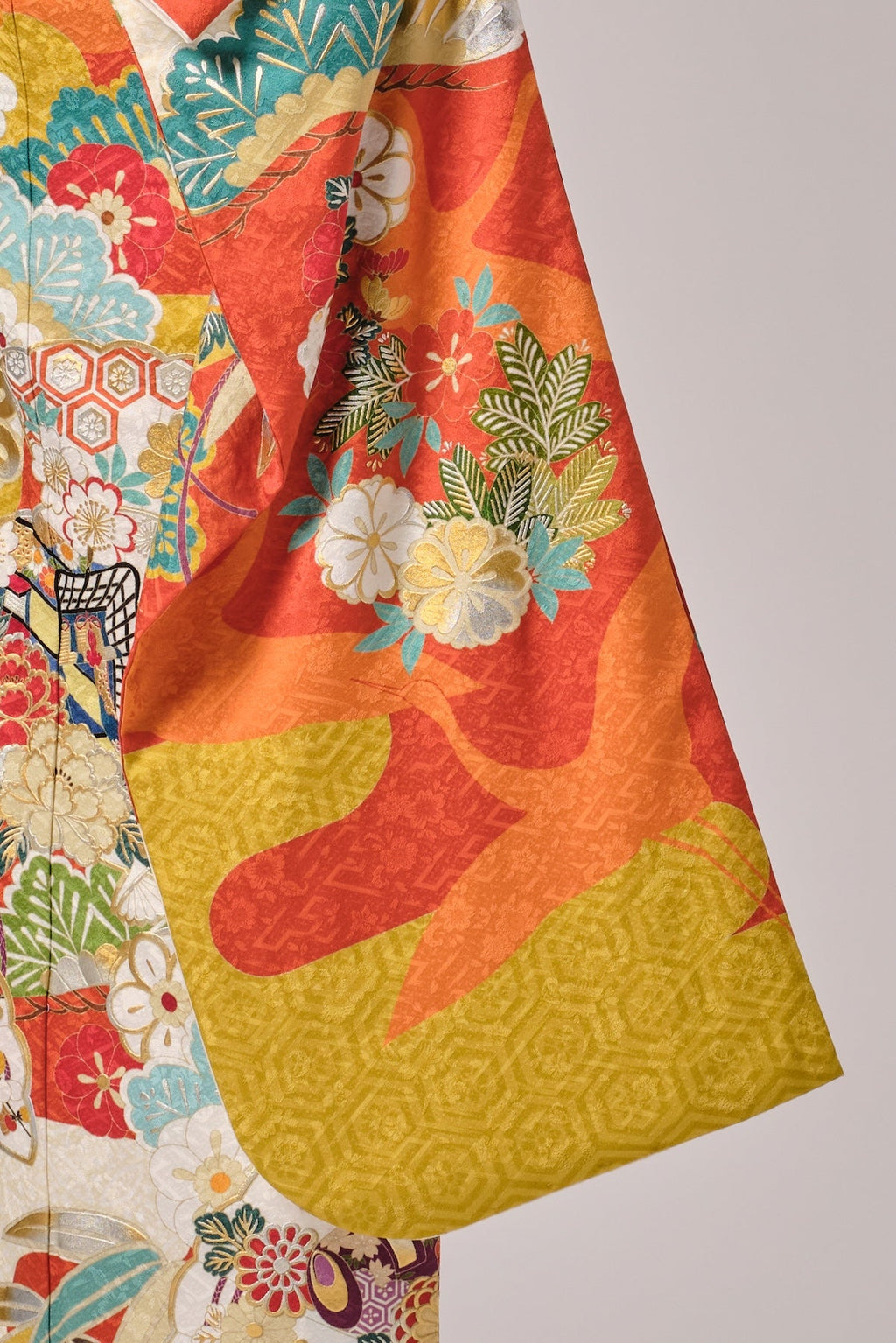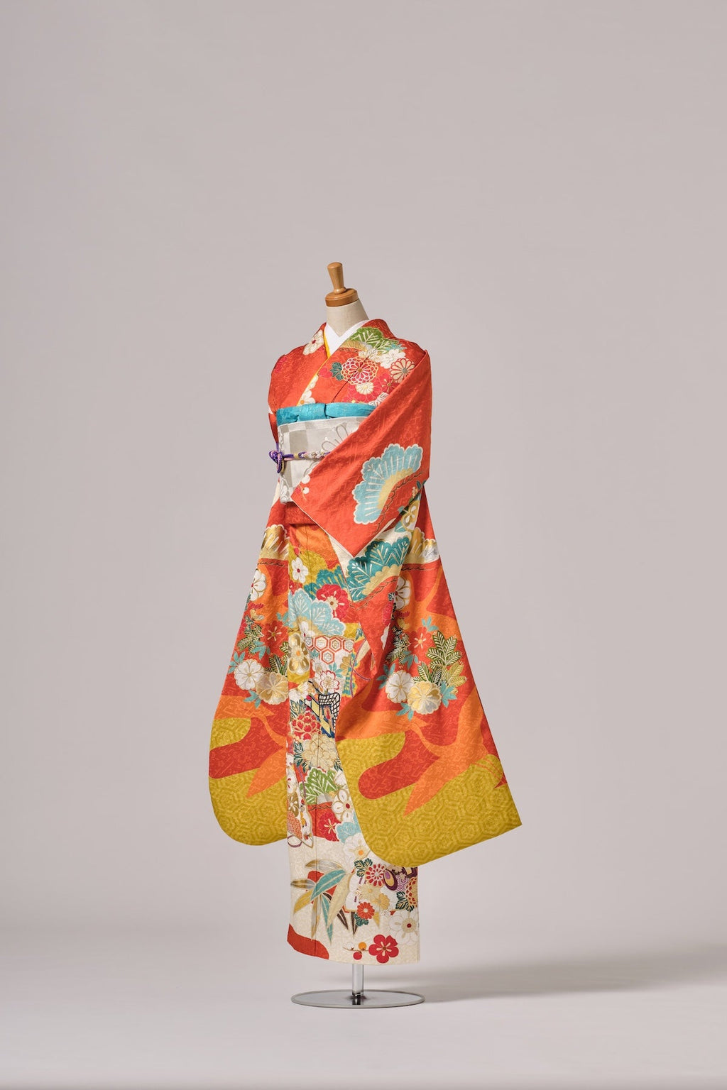 橙と白の地に、鶴や松・牡丹などの吉祥文様をあしらった華やかで格調高い振袖。