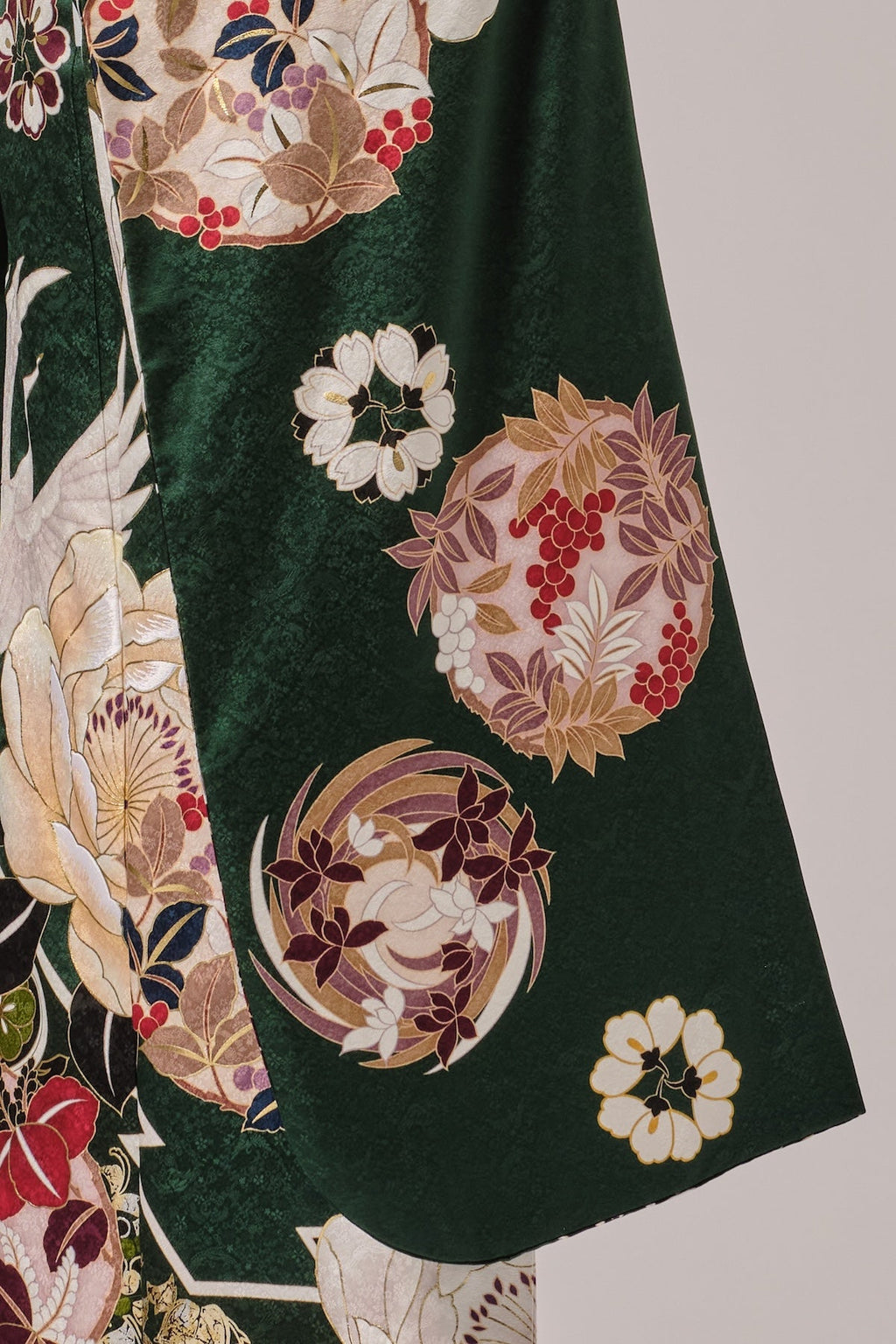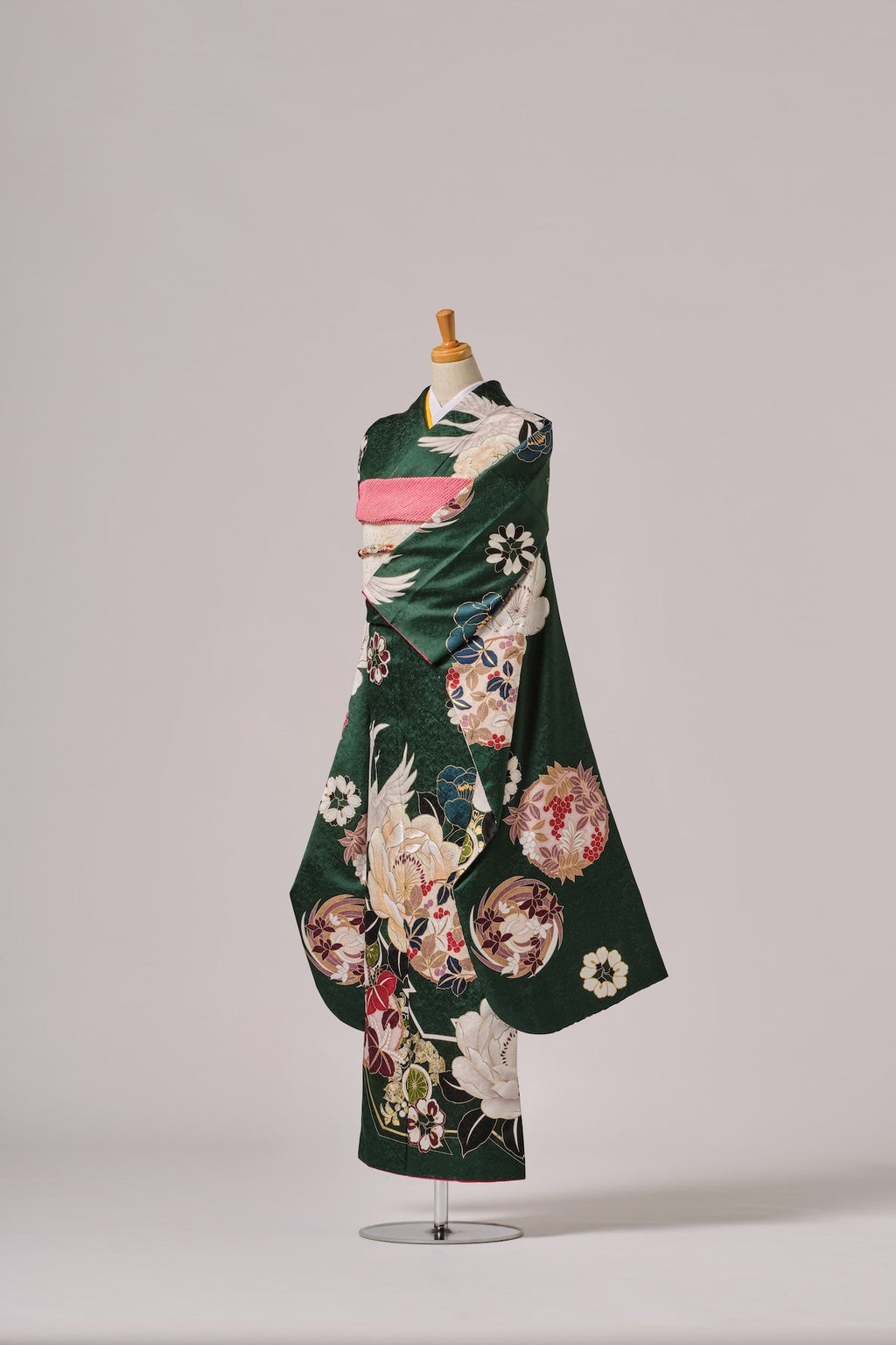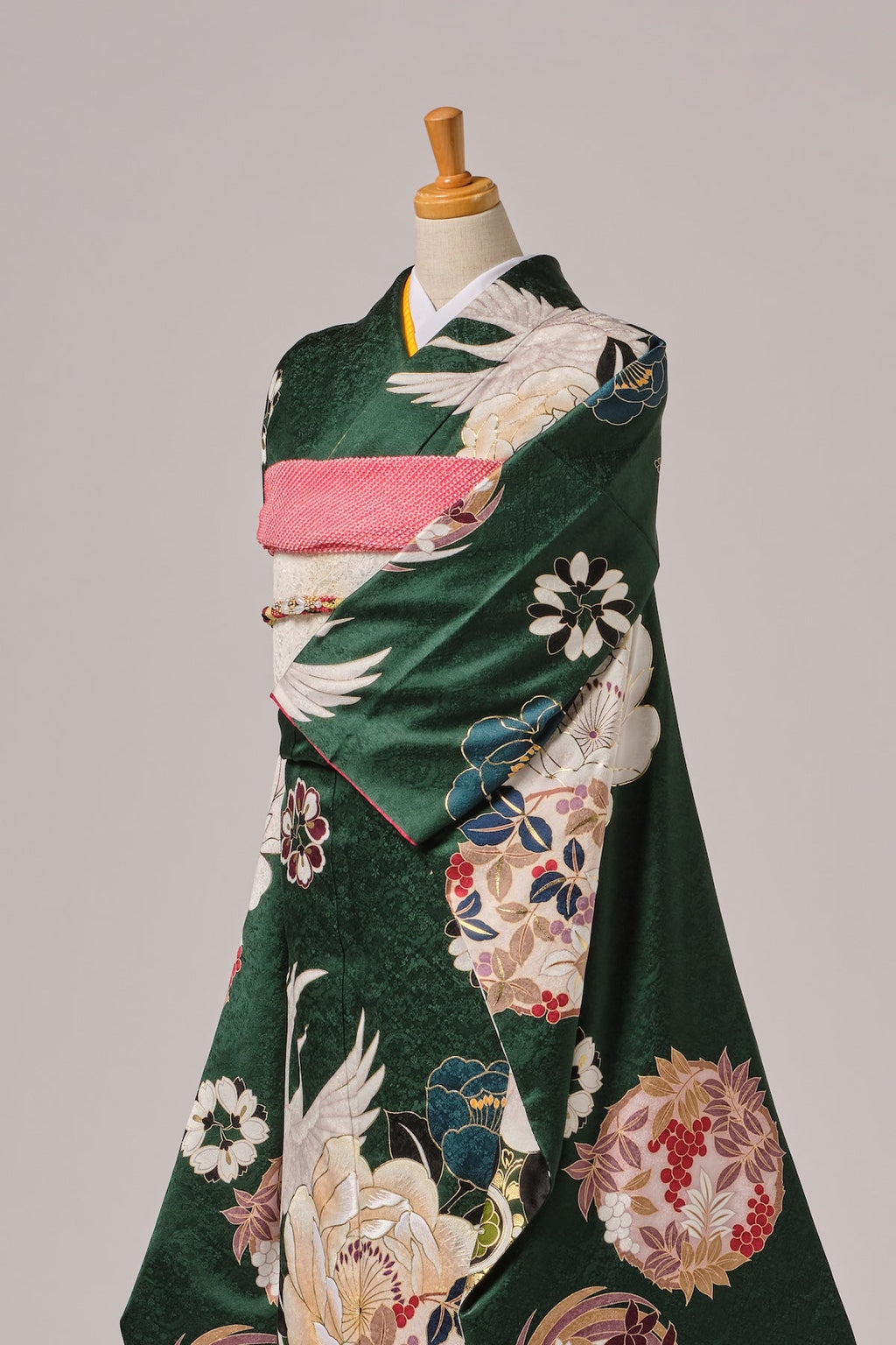 落ち着いた緑をベースに、華やかで優美な柄が映える振袖です。落ち着いた華やかさが、洗練された雰囲気を演出します。