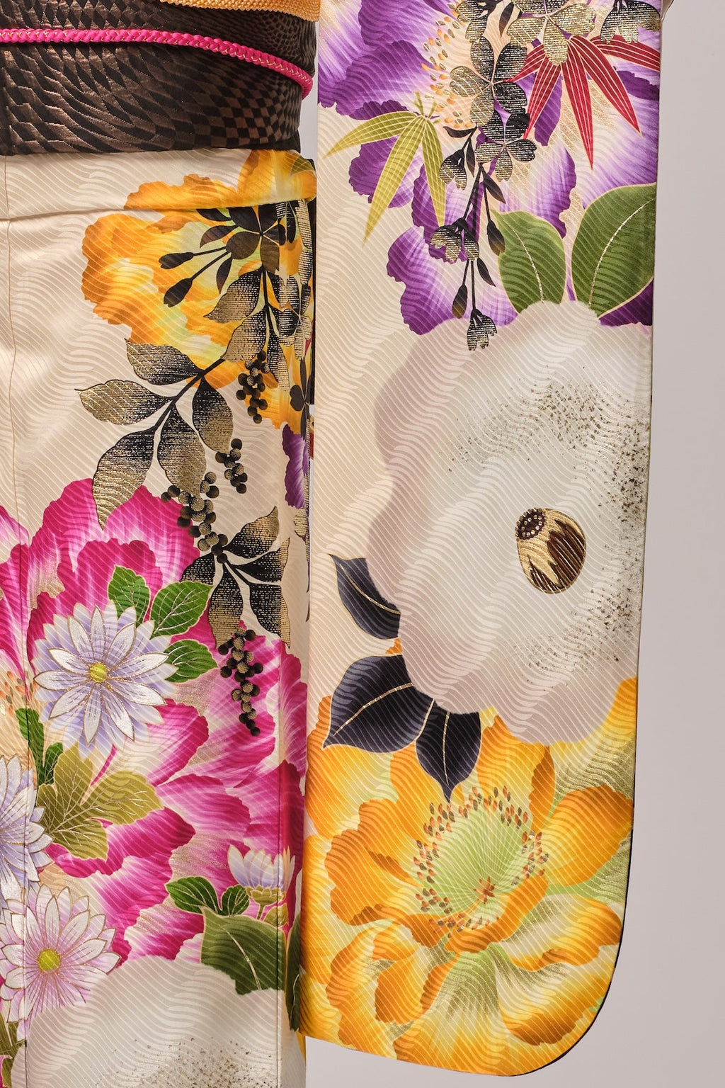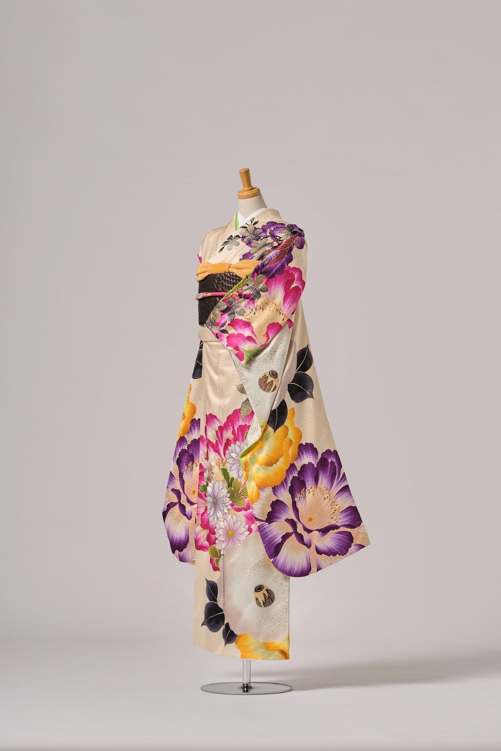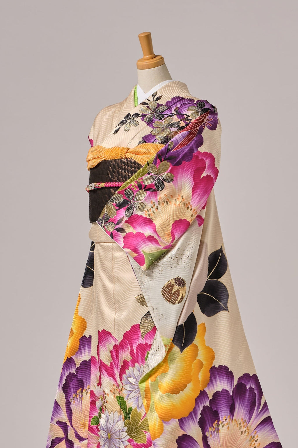 クリーム地に大輪の花柄が華やかさを添える。晴れの舞台にふさわしい気品と華やぎを兼ね備えた逸品です。