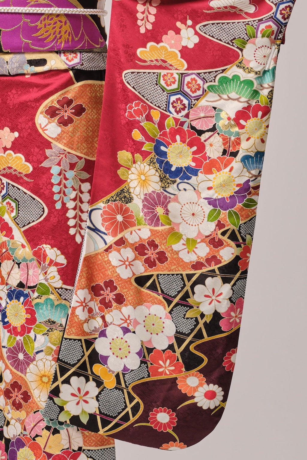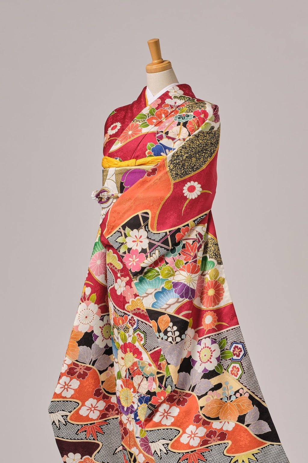 赤色のコントラストが美しく、古典柄が映えるデザインで、気品あふれる晴れ姿を演出します。
