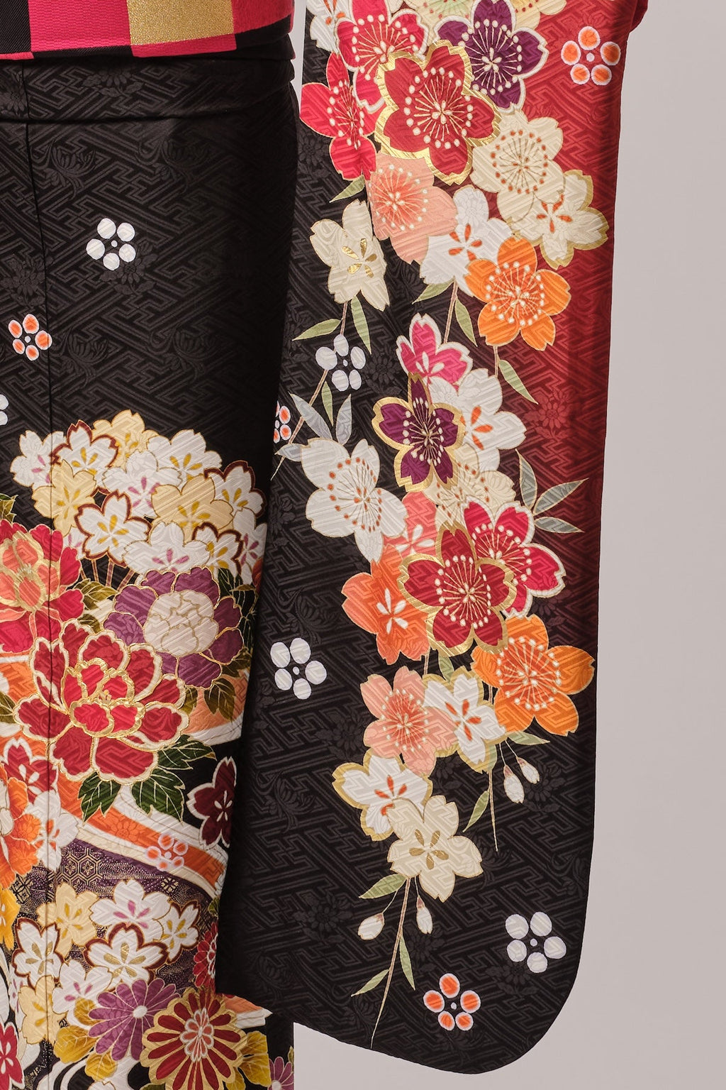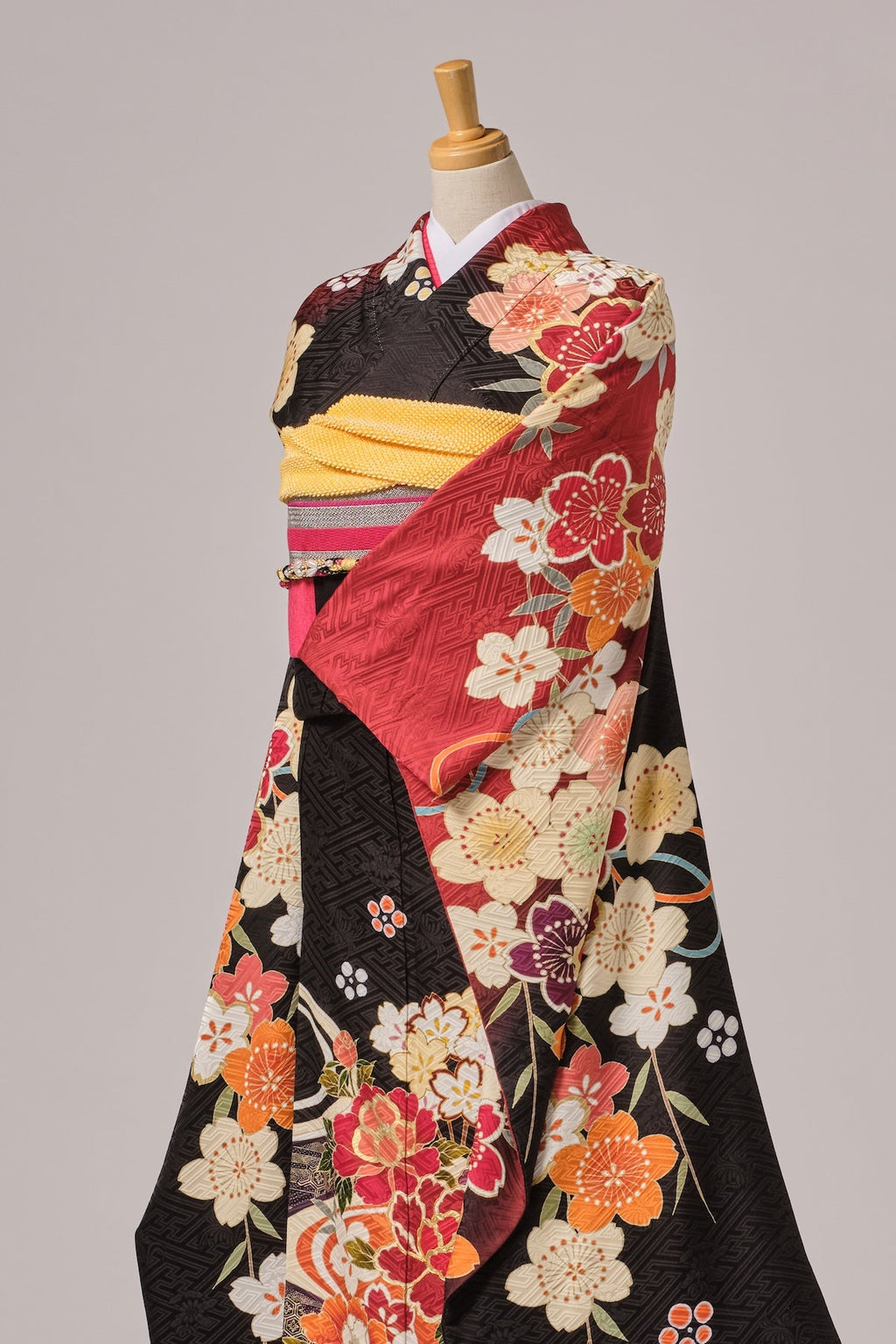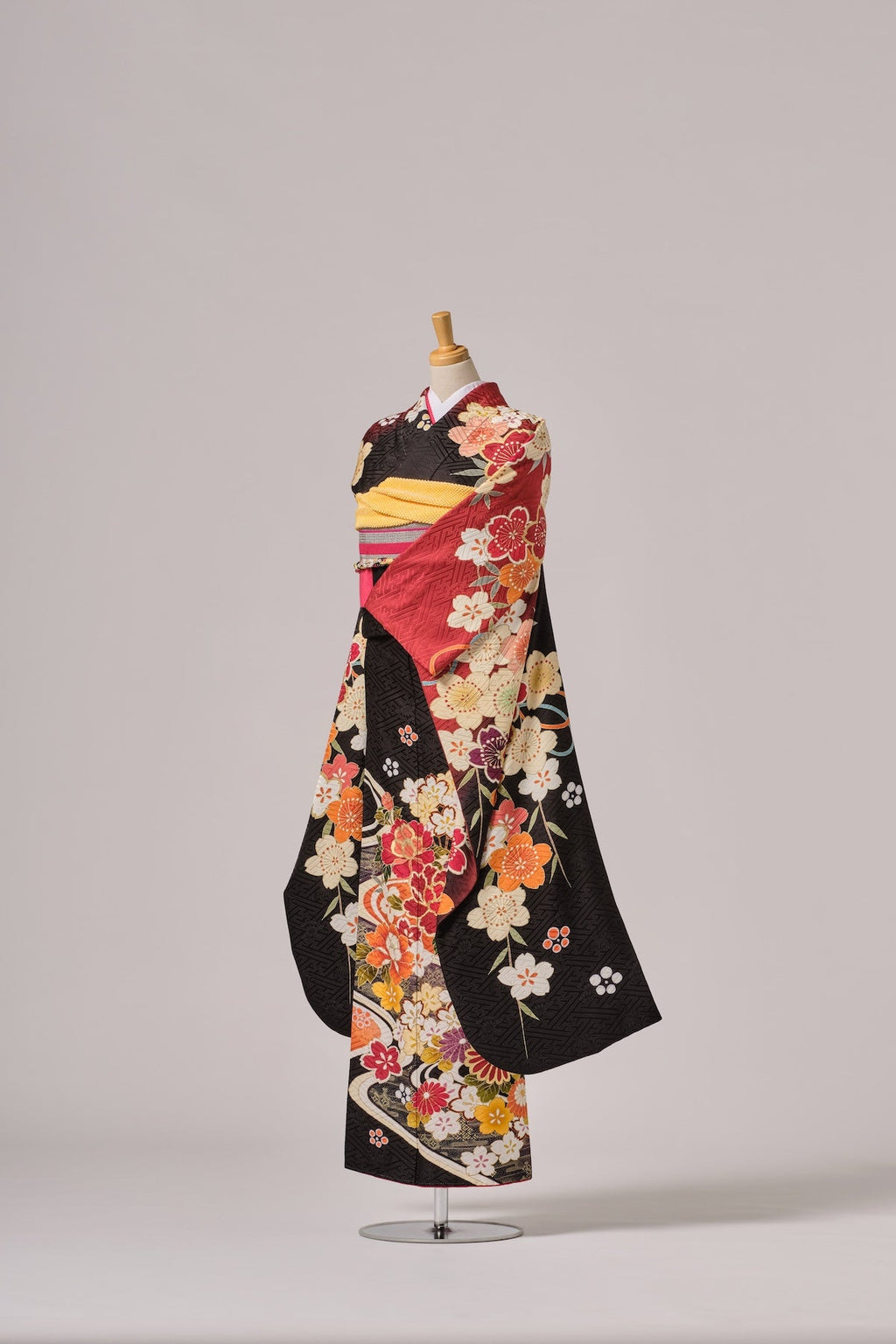 黒地に古典柄が映える振袖。伝統美が息づく柄ゆきが、世代を超えて愛される魅力を放ちます。