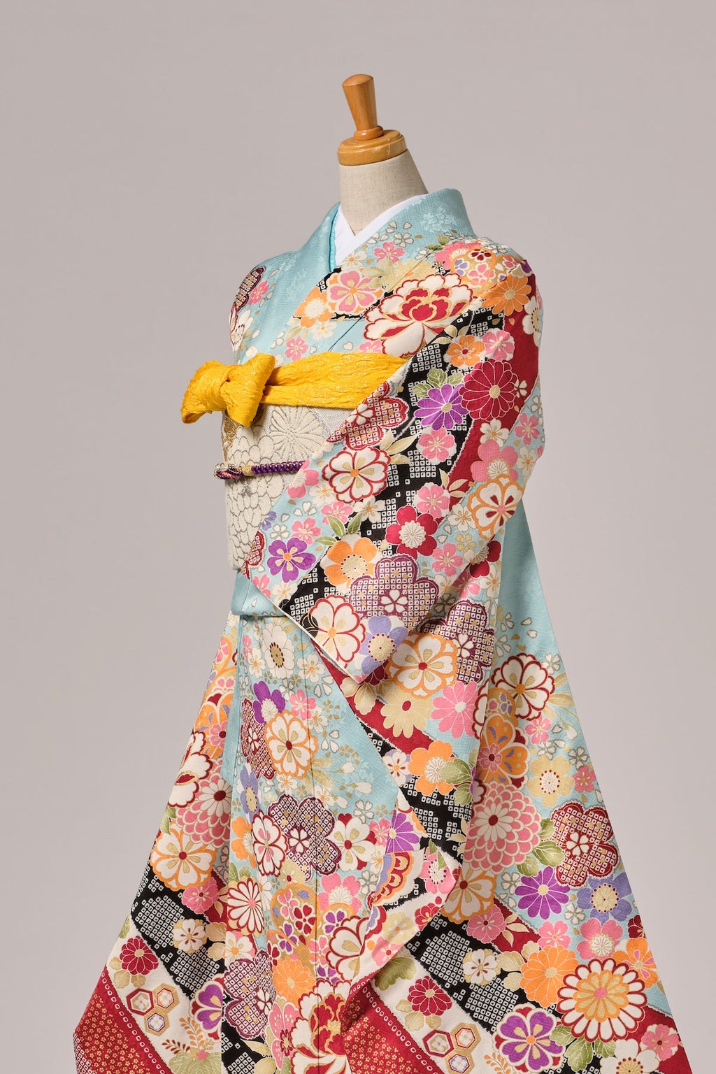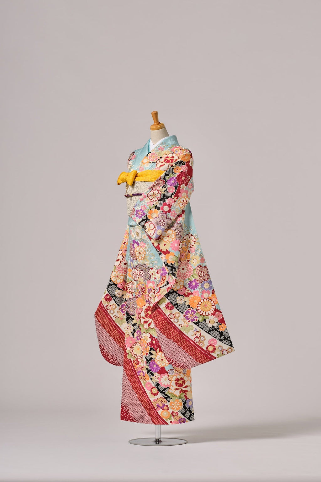 振袖、帯、長襦袢、帯揚げ、帯締め、半衿、前板、伊達〆、帯枕、衿芯、腰紐4本、三重仮紐、後ろ板、コーリンベルト