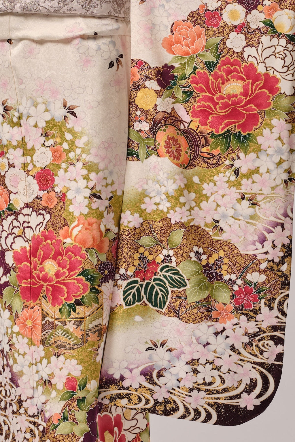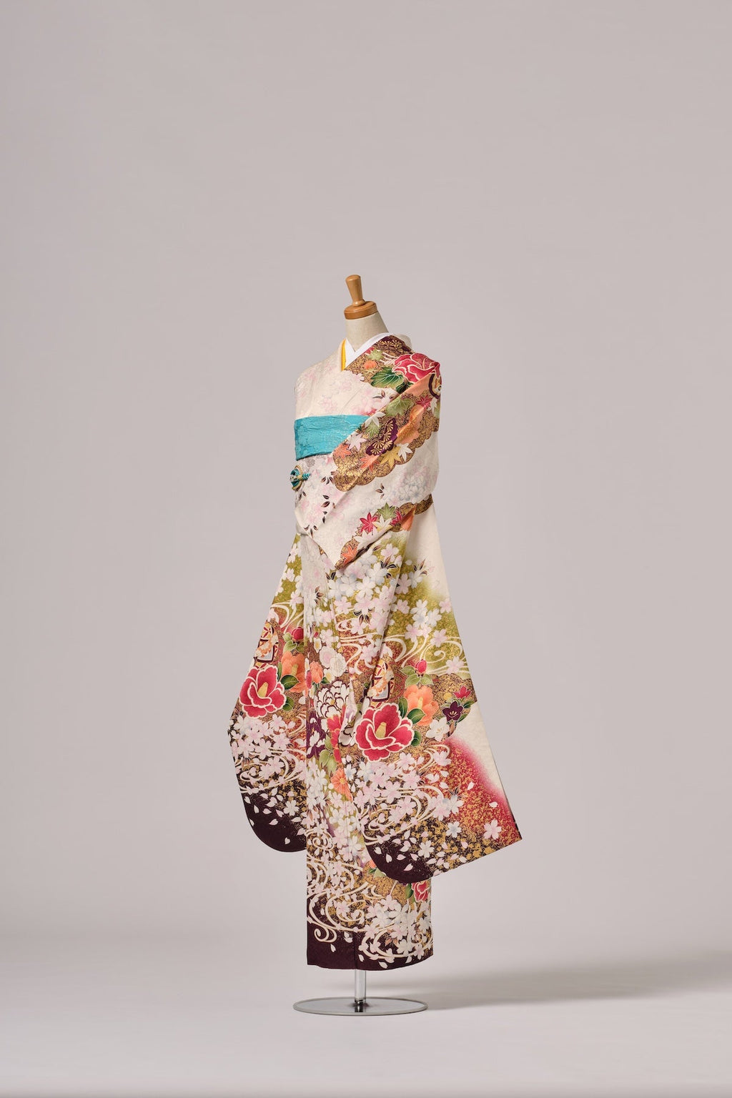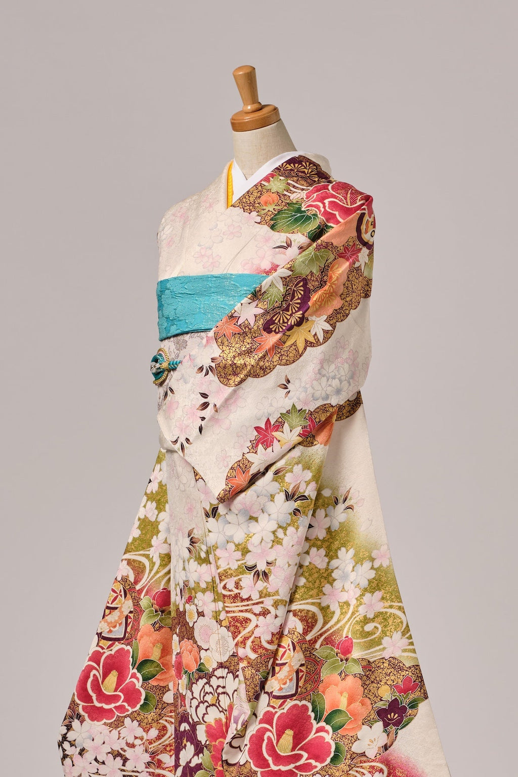 振袖、帯、長襦袢、帯揚げ、帯締め、半衿、前板、伊達〆、帯枕、衿芯、腰紐4本、三重仮紐、後ろ板、コーリンベルト