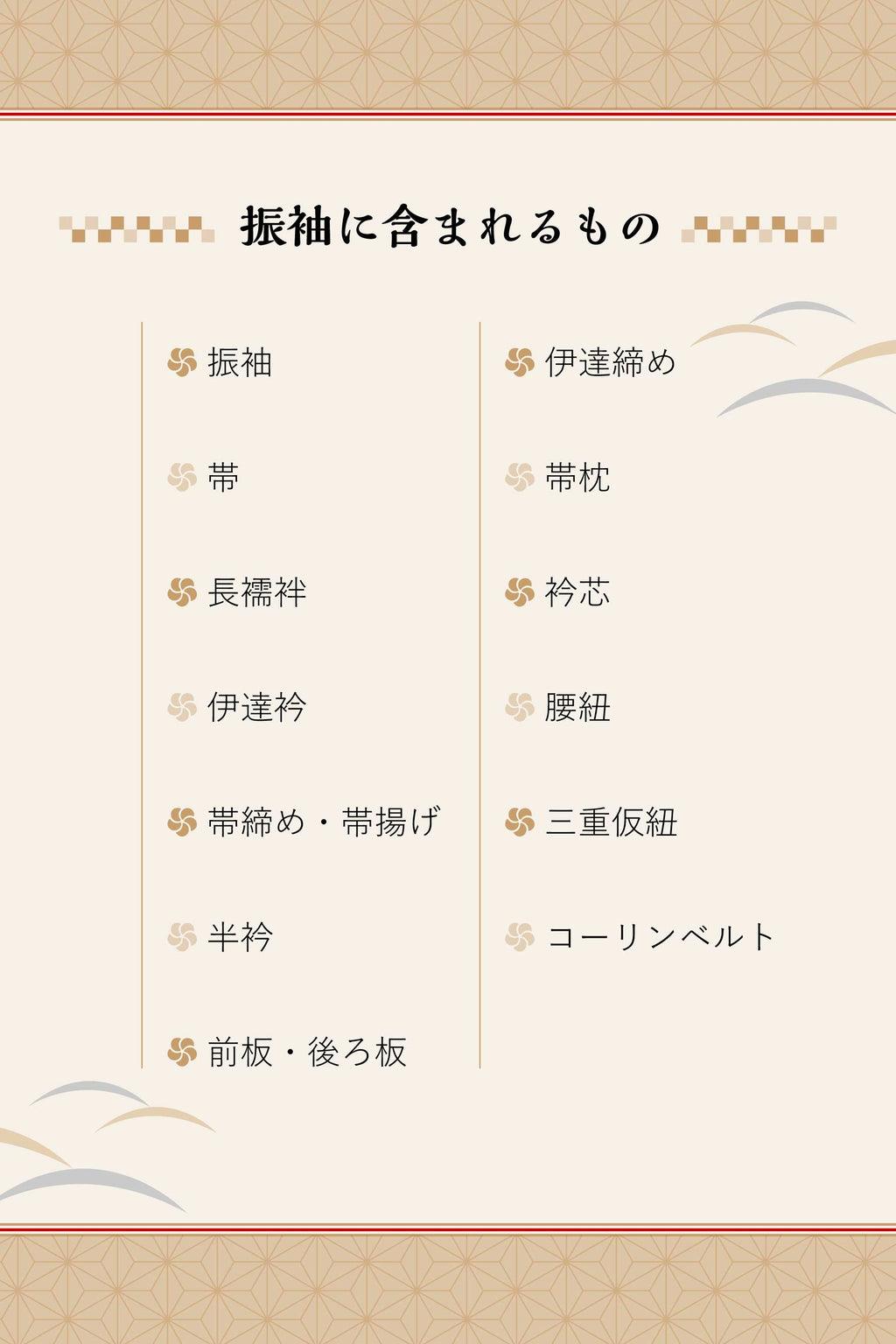 振袖、帯、長襦袢、帯揚げ、帯締め、半衿、前板、伊達〆、帯枕、衿芯、腰紐4本、三重仮紐、後ろ板、コーリンベルト