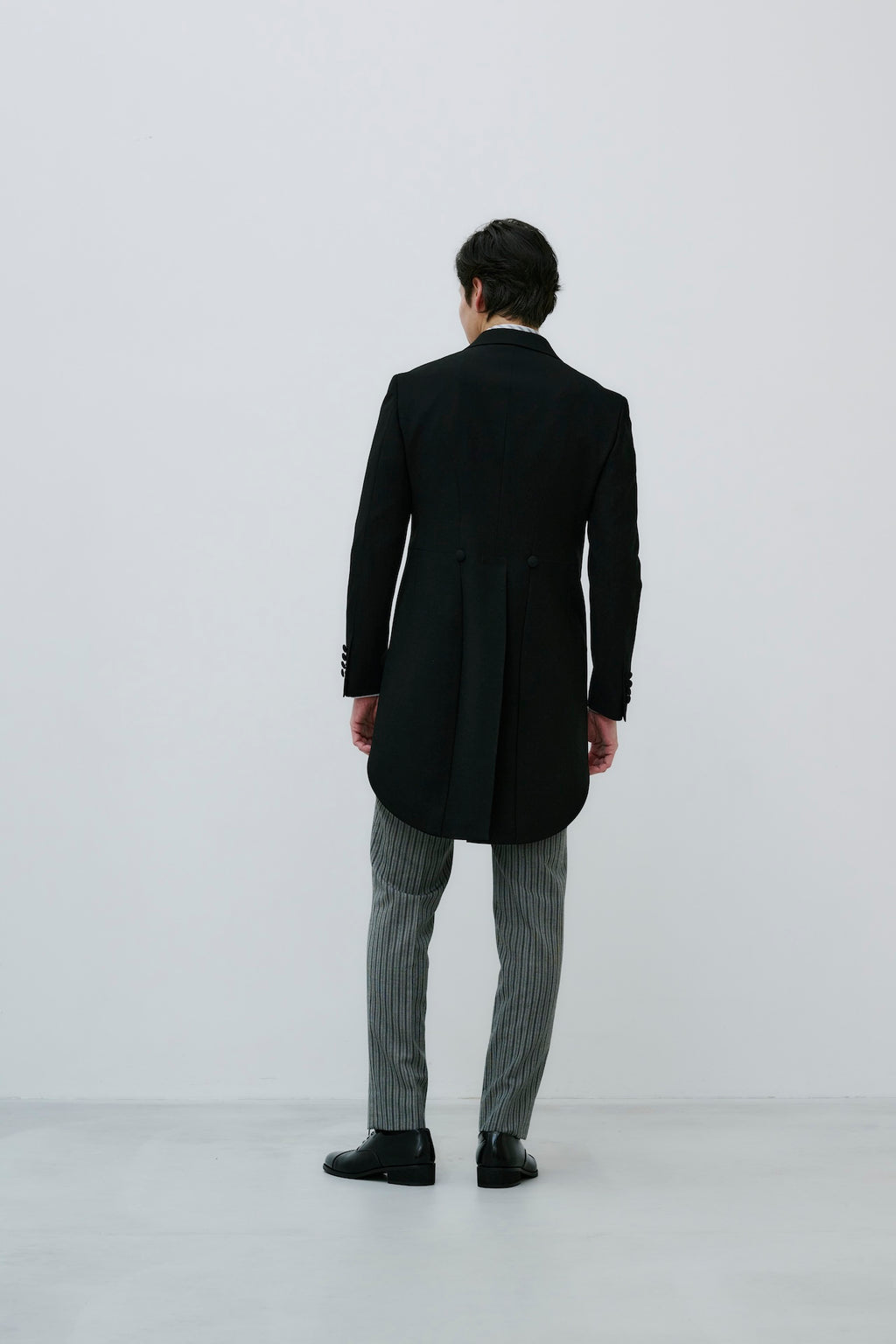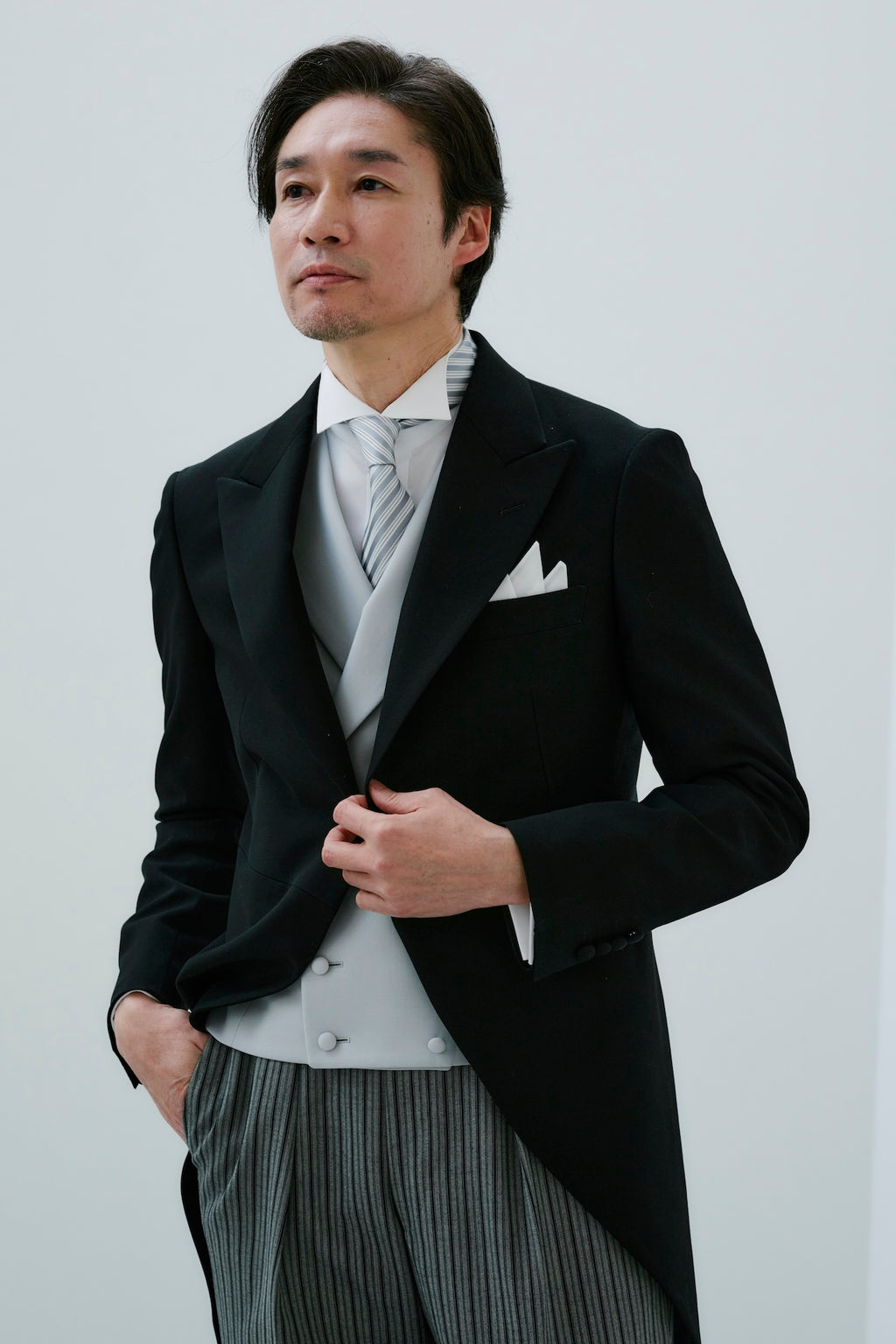 深みのあるブラックが特徴の国産ウールを使用した、格式高い列席者用モーニング。